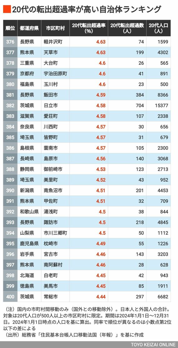 若年層の人口流出が目立つ地域はどこ? 20代の「転出超過率」が高い自治体ランキング