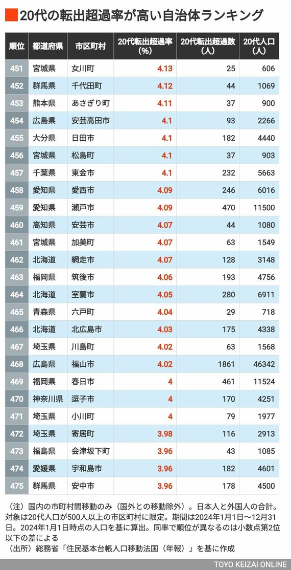 若年層の人口流出が目立つ地域はどこ? 20代の「転出超過率」が高い自治体ランキング
