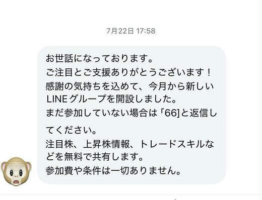 相互フォローになると、相手はDMを送信してくる。内容はどの場合もほぼ一緒で、「LINEグループを開設しました。まだ参加していない場合は66と返信してください」というように、投資情報を共有するLINEグループに勧誘される。