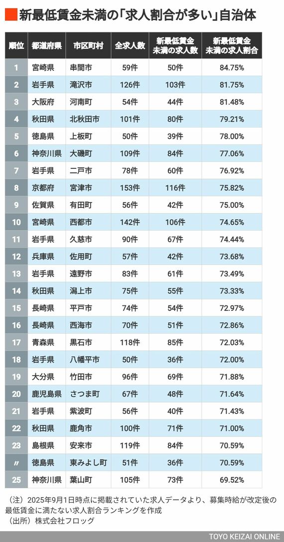 1位は改定後の最低賃金に満たない求人が84.75%…「新最低賃金に"満たない"求人割合」が多い市区町村ランキング100
