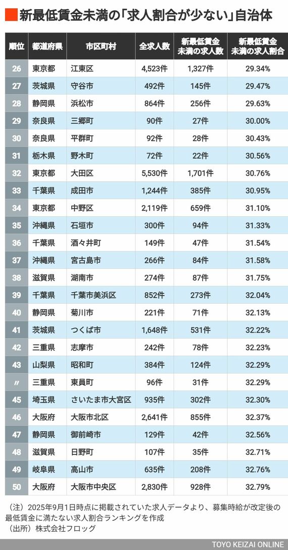 3位は御殿場市、2位は俱知安町、1位は…? 「新最低賃金に満たない求人」が"少ない"市区町村ランキングTOP100