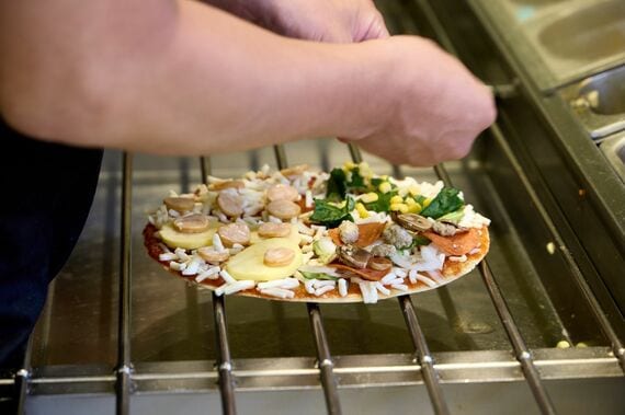 オーダーをするとキッチンですぐに調理が始まった。スタッフがボール型の生地を円盤状に伸ばし、チーズや肉などをトッピングしてベルトコンベア式のオーブンに投入。約5分でカリカリに焼き上がったピザが出てきた。そして、宅配ピザと同じピザボックスに詰め込まれて完成。