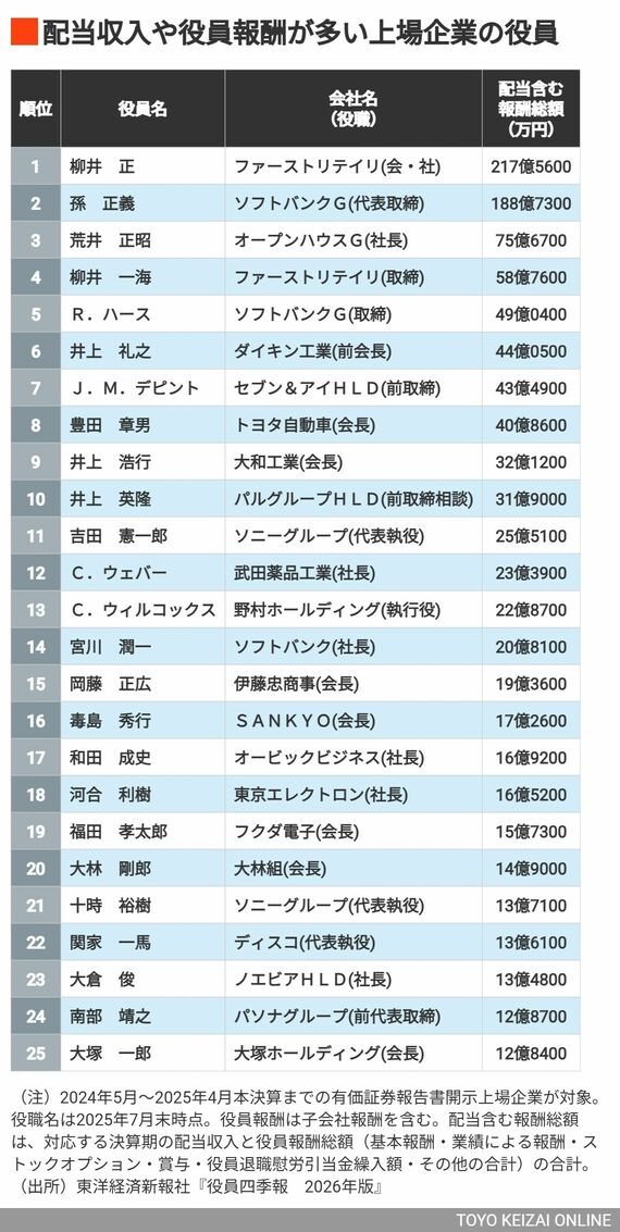 2位は188億円の孫正義氏、1位は217億円の… 配当含む「年収"1億円超"」上場企業役員ランキング