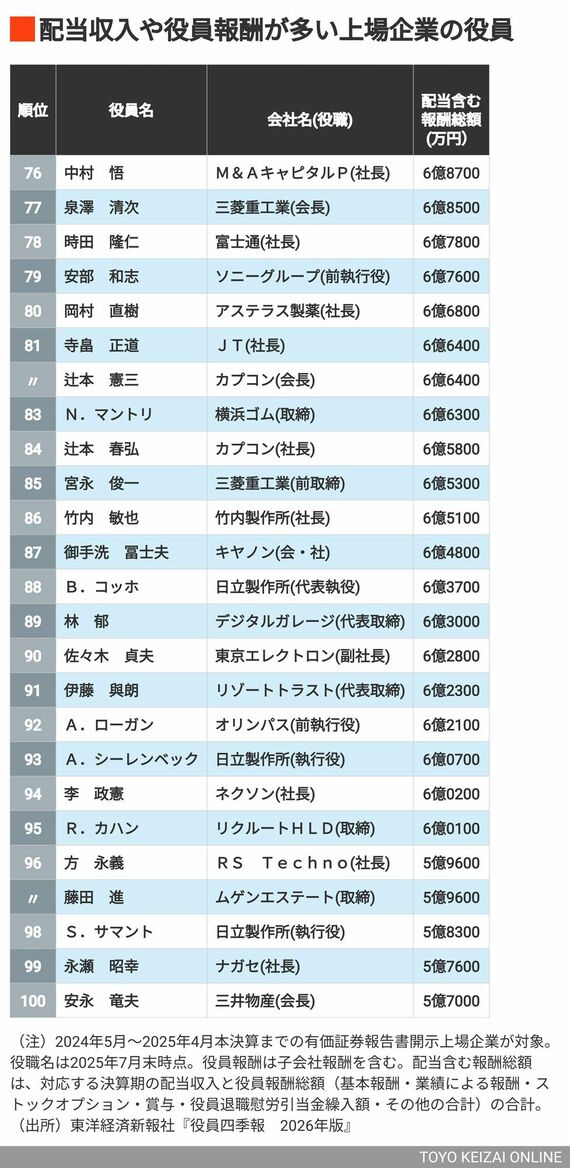 101位以降のランキングは、「《完全版》配当含む「年収1億円超」経営者TOP500人」(有料会員登録が必要です)でご覧いただけます。