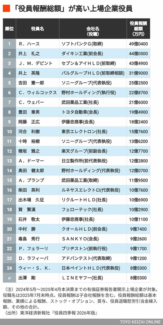首位となったのは昨年2位だったソフトバンクグループのレネ・ハース氏だ。役員報酬総額は49億0400万円(昨年は34億5800万円)と、約50億円に迫る水準に達した。
