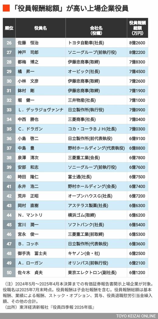 ビジネス 《完全版》「年収1億円超」上場企業役員トップ500人ランキング、1位は49億円超え、10億円超えも19人! 500位であっても年収1億7100万円 3分で読める 公開日時:2025/12/04 05:00 有料会員限定 『役員四季報』編集部 フォロー 1/20 PAGES 2/20 PAGES 26~50位は? 次ページが続きます:【まだまだいる5億円超】 3/20 PAGES 4/20 PAGES 5/20 PAGES この記事は有料会員限定です 残り 150文字 ログイン 有料会員登録