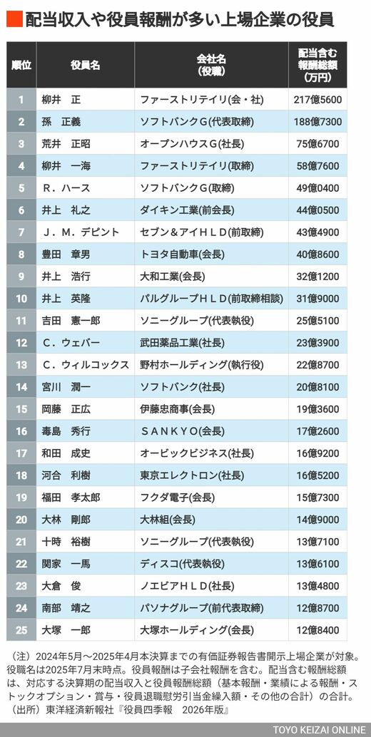 【2025年12月4日8時10分追記】初出時の記述に誤りがありましたので、上記の通り訂正しました。【2025年12月4日21時20分追記】ランキングに誤りがありましたので以下のように修正しました。一時的にソフトバンクは除いていますが、あらためて完全版を作成の予定です。【2025年12月5日16時00分追記】一部の方の配当含む報酬総額の計算に誤りがあったため、ランキングを修正しました。お詫びして訂正します。