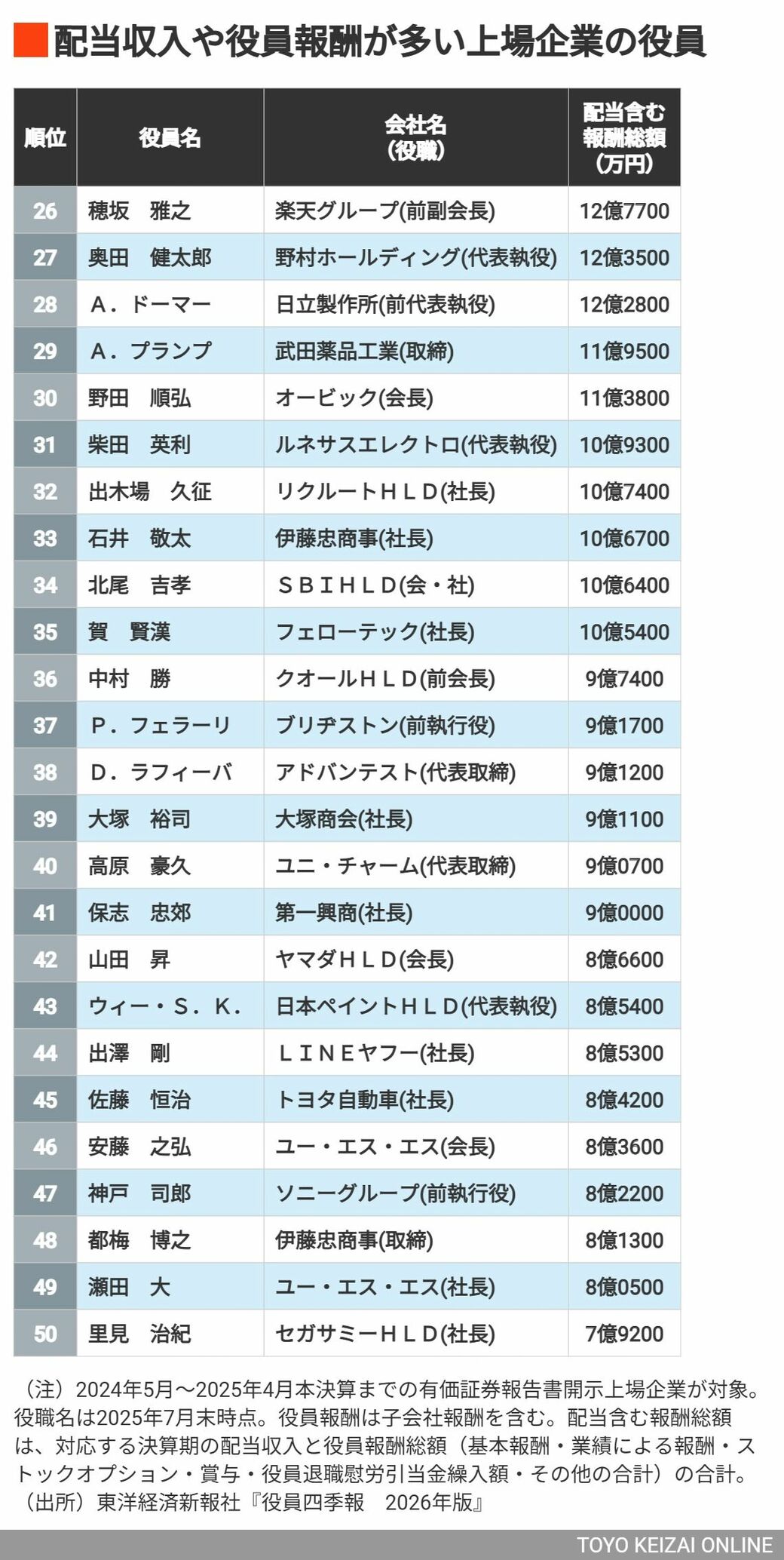 《完全版》配当含む「年収"1億円超"」上場企業役員ランキング 2位は188億円の孫正義氏、1位は217億円の…