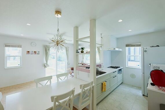 リビングは家族の中心となる場所。子どもが自由に遊べるようにスペースを広く確保し、家具も最小限に抑えることでゆとりが生まれ、家族が自然と集まる空間になっています。