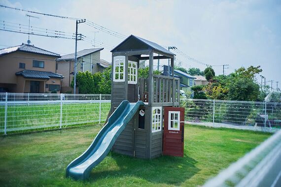 長女や愛犬を遊ばせやすいように、庭とのつながりも大切にしています。芝生の庭へはリビングからのみ直接のアクセスを可能とし、庭にはフェンスをめぐらせてあるため、まだ小さい娘や愛犬を自由に走り回らせても安心です。