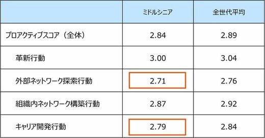 スコアが、革新行動、組織内ネットワーク構築行動、キャリア開発行動、外部ネットワーク探索行動の順になっているという傾向は、全世代平均スコアと同様である。一方、外部ネットワーク探索行動とキャリア開発行動は2.8を下回っており、その低さが目立つ。