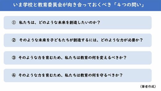 このような未来を回避するため、今学校と、そして学校にとって一番身近な存在である教育委員会は、以下の4つの問いに向き合っておく必要があります。これが、学校が自律的に進んでいくうえでの「羅針盤」となるはずです。