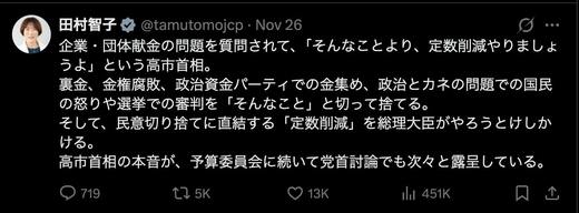 これに先立つ26日夜には、共産党の田村智子委員長が自身のXで、「政治とカネの問題での国民の怒りや選挙での審判を『そんなこと』と切って捨てる。そして、民意切り捨てに直結する『定数削減』を総理大臣がやろうとけしかける。高市首相の本音が、予算委員会に続いて党首討論でも次々と露呈している」と厳しく批判した。