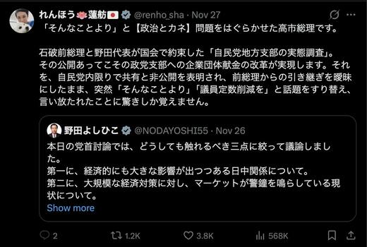 これにすぐ反応したのは、かねて「政治とカネ」を追及してきた野党陣営である。立憲民主党の蓮舫参院議員は27日、自身のX(旧ツイッター)に、「前総理からの引き継ぎを曖昧にしたまま、突然『そんなことより』『議員定数削減を』と話題をすり替え、言い放たれたことに驚きしか覚えません」と投稿した。