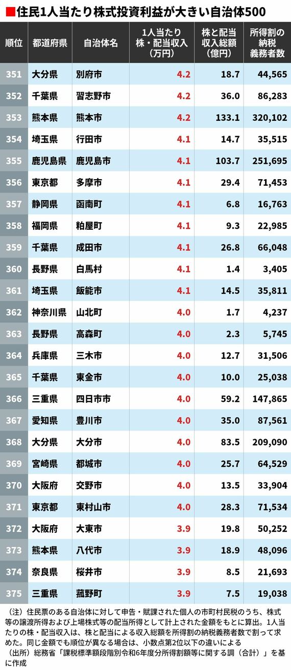 住民1人当たり株式投資の稼ぎが大きい自治体ランキング 5位は東京都渋谷区、4位は千葉県浦安市、ではトップ3は?