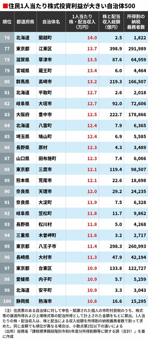 住民1人当たり株式投資の稼ぎが大きい自治体ランキング 5位は東京都渋谷区、4位は千葉県浦安市、ではトップ3は?