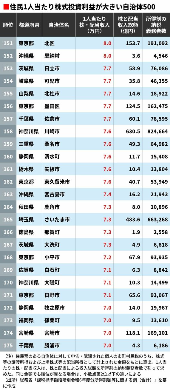 住民1人当たり株式投資の稼ぎが大きい自治体ランキング 5位は東京都渋谷区、4位は千葉県浦安市、ではトップ3は?