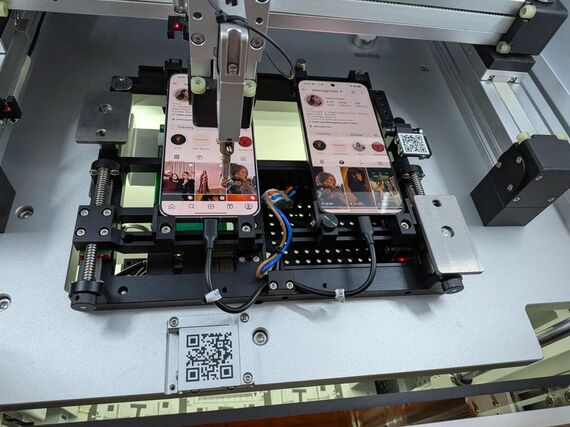 テスト担当者がプラットフォームでタスクを下すと、AIが自動分析してスケジュールを割り当てる。搬送ロボットが端末をテスト機台に搬入すると、指先を模したロボットが画面を操作する。4K 60fps動画録画、ショート動画の閲覧、メッセージ交流など、さまざまなシーンをシミュレートし、ハイスピードカメラが画面遷移を撮影する。