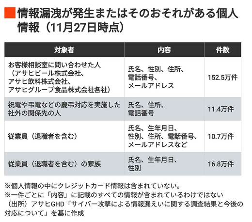 11月27日の発表でもう1つ注目されたのが、個人情報191万4000件が「漏洩した、または漏えいの可能性がある」とされた点です。内訳を見ると、お客様相談室への問い合わせ情報、慶弔対応した関係先、従業員やその家族・退職者の情報などが含まれています。