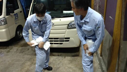 清掃の作業着に着替えた吉住区長は、本日の収集に必要不可欠となるマスクと大きなビニール袋を渡された。この備品がなぜ必要となるかはまだ分からず、マスクをはめ、ビニール袋は太もものポケットにしまい込み、出庫前の腰痛予防体操を行った。