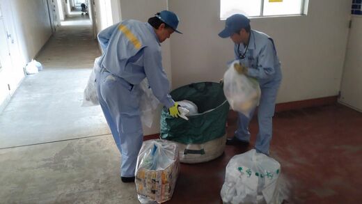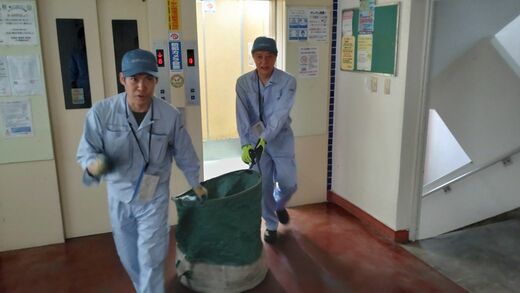 フロアごとにごみを集め、専用の袋に入れてエレベーターで下の階へと向かい、いっぱいになると軽小型ダンプに積み込んでいく作業を繰り返していく。