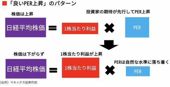 まずは、投資家の期待が先行してPERが上昇することで日経平均株価が上昇します。これが足もとの株価の状況です。その後、1株当たり利益が期待どおりに上昇することで株価は下がらないパターンです。