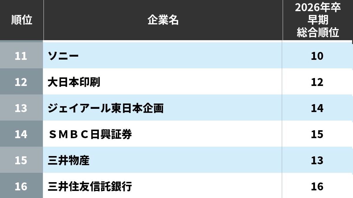2位は日本生命保険(前年3位)、3位は大和証券グループ(前年4位)。いずれも順位を1つずつ上げ、就活生からの支持をさらに固めた格好だ。生命保険や証券といった金融大手は、「安定性+専門性」のセットで早期から人気が高い。