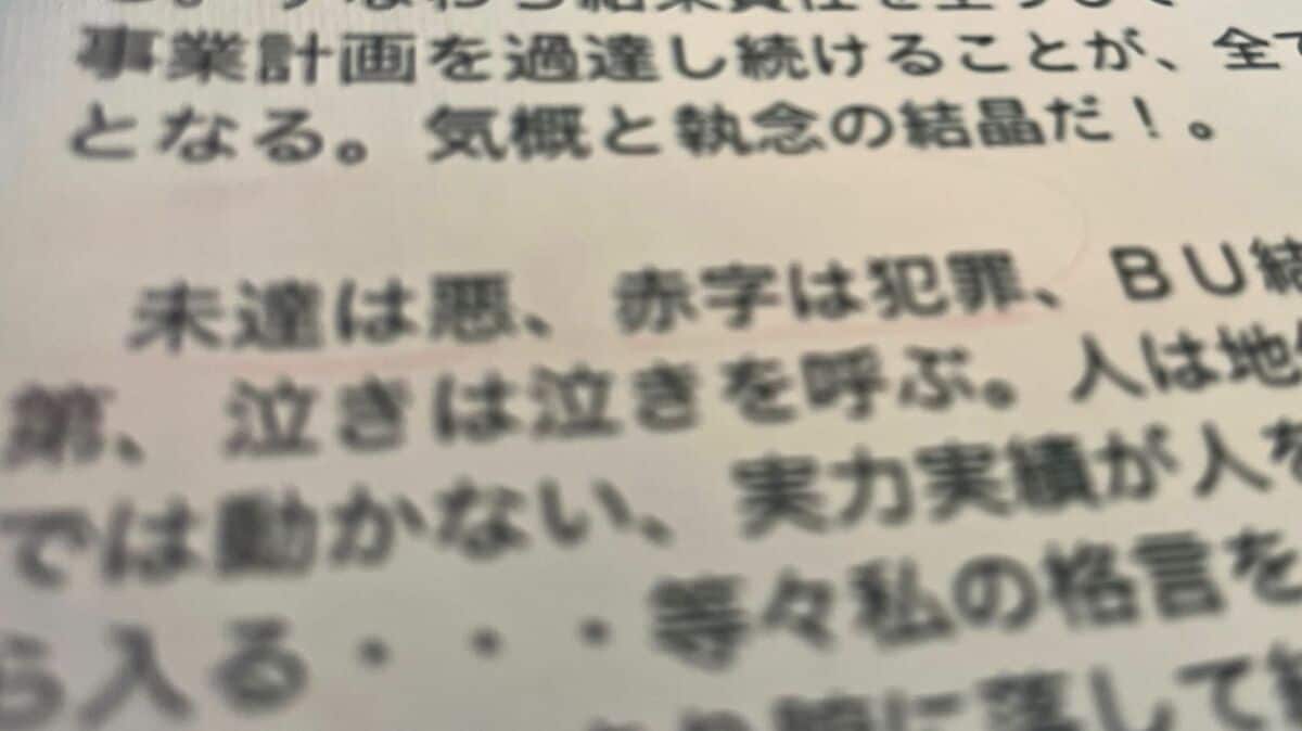 社内で配信された永守氏のメッセージ。「未達は悪、赤字は犯罪」と記されている(筆者撮影)