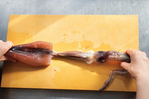 ①イカの胴体に手を入れて肝とつながっている部分をはずし、真っ直ぐに引き抜く。