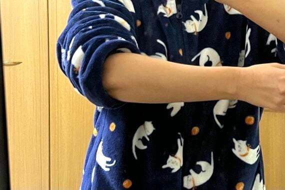 袖のゴム感は、皿洗いなどの際に腕まくりしやすくなっている。まくるとちょうど関節部分でとまりやすくなっているので、皿洗いや風呂掃除などの水仕事もしやすい。