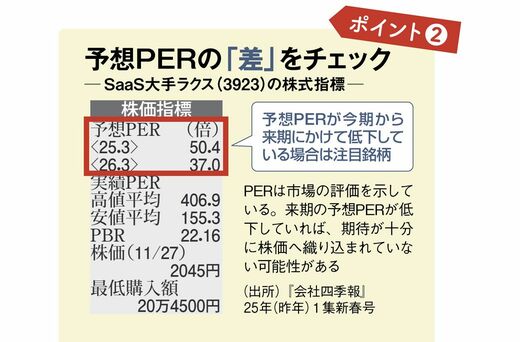 例えば、昨年の新春号でラクスの25年3月期の予想PERは50.4倍、翌期予想は37.0倍だった。あくまで理論上の話だが、現状の50.4倍が妥当なPERならば、株価は約36%上昇する計算になる。実際、同社は年初から9月高値まで約50%上昇した。四季報では、まず予想PERを拾い読みするのも裏技だ。