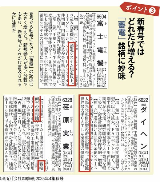 新規参入や協業なども盛んな分野で、四季報の記事で「蓄電」に言及した件数は25年夏号で49件、秋号で64件と増加傾向。秋号では富士電機の業績欄に「蓄電システム想定以上」とあり、独自増額の根拠の1つとなっている。ほかにもダイヘンや荏原実業など大手機械銘柄の記事にも登場しており、注目テーマとして存在感を高めているとわかる。
