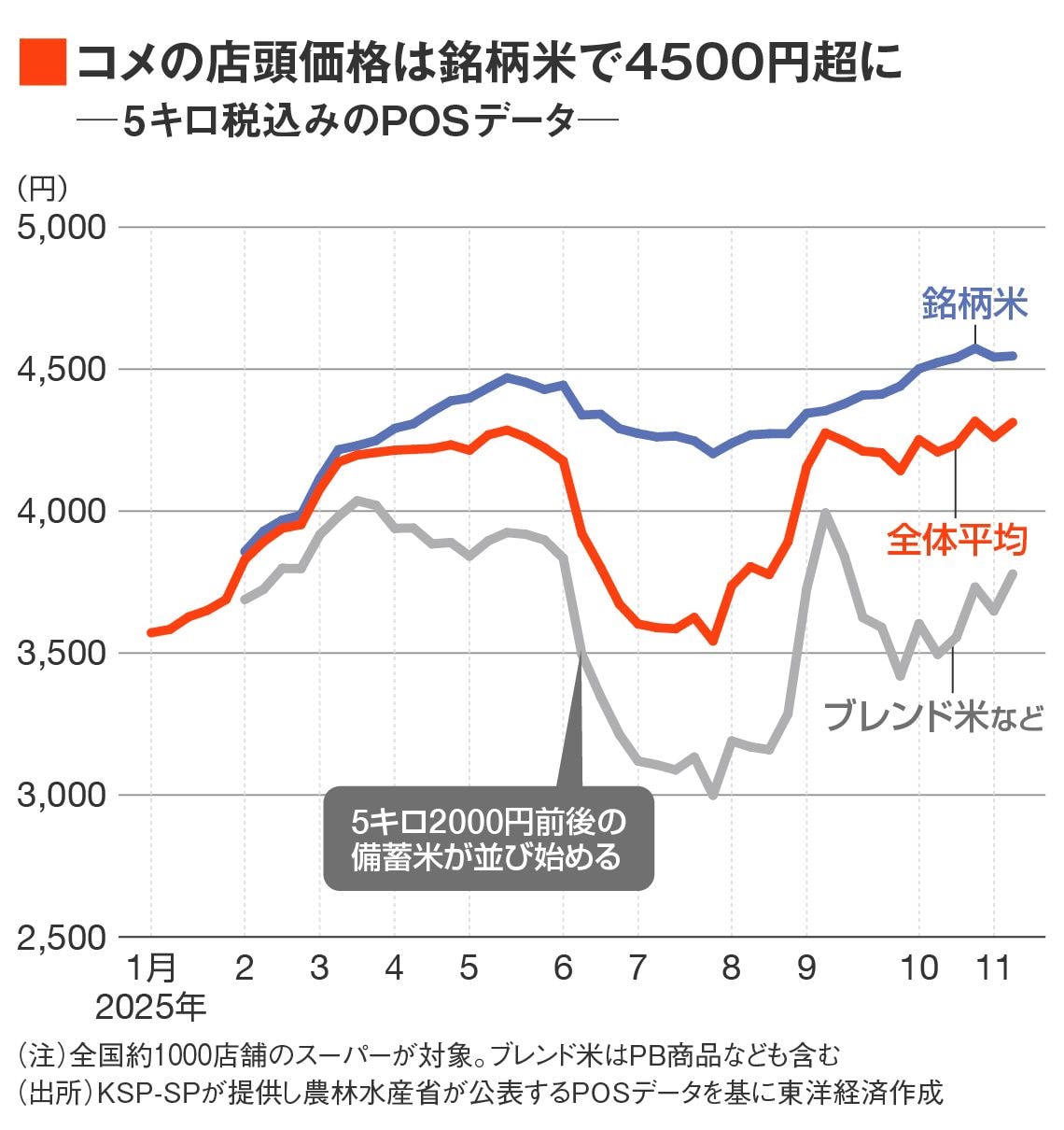 それを米卸が精米し、スーパーに並ぶと店頭価格が5キロ4500円前後、銘柄によって5000円を超える。これでは高すぎて売れない。パンや麺に流れ、コメの消費は8カ月連続で前年割れだ。