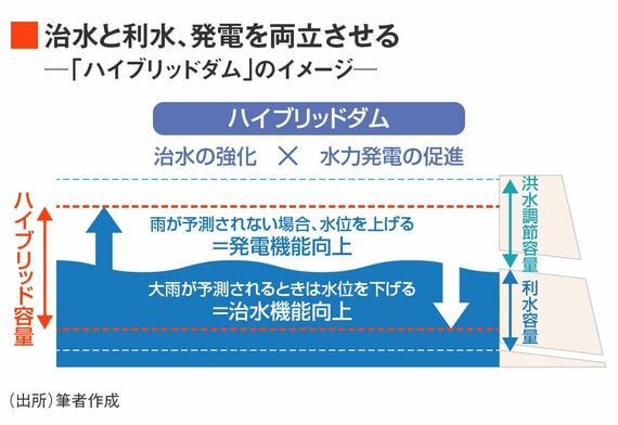 ハイブリッドダムの特徴は、既存の治水ダムや多目的ダムに、水力発電という収益源を後付けすることにある。ダムの水位を通常よりやや高めに維持したり、降雨後に放流するタイミングを工夫したりすることで、発電量を増やすことができる。新たに発電設備を整備することも予定されているが、前出の国交省直轄の6つのダムでは運用改善だけでも、年215万キロワット時(一般家庭約500世帯相当)の発電量の増強効果が確認されている。