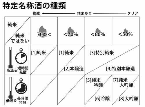 これら3つの基準から、特定名称酒は8つの種類に分類されます。