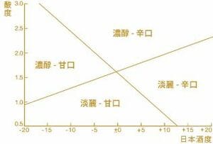 味が口の中で長く持続するか(一般的には酸度が低くて日本酒度が低い)、もしくはキレがいいか(一般的に酸度が高い日本酒)
