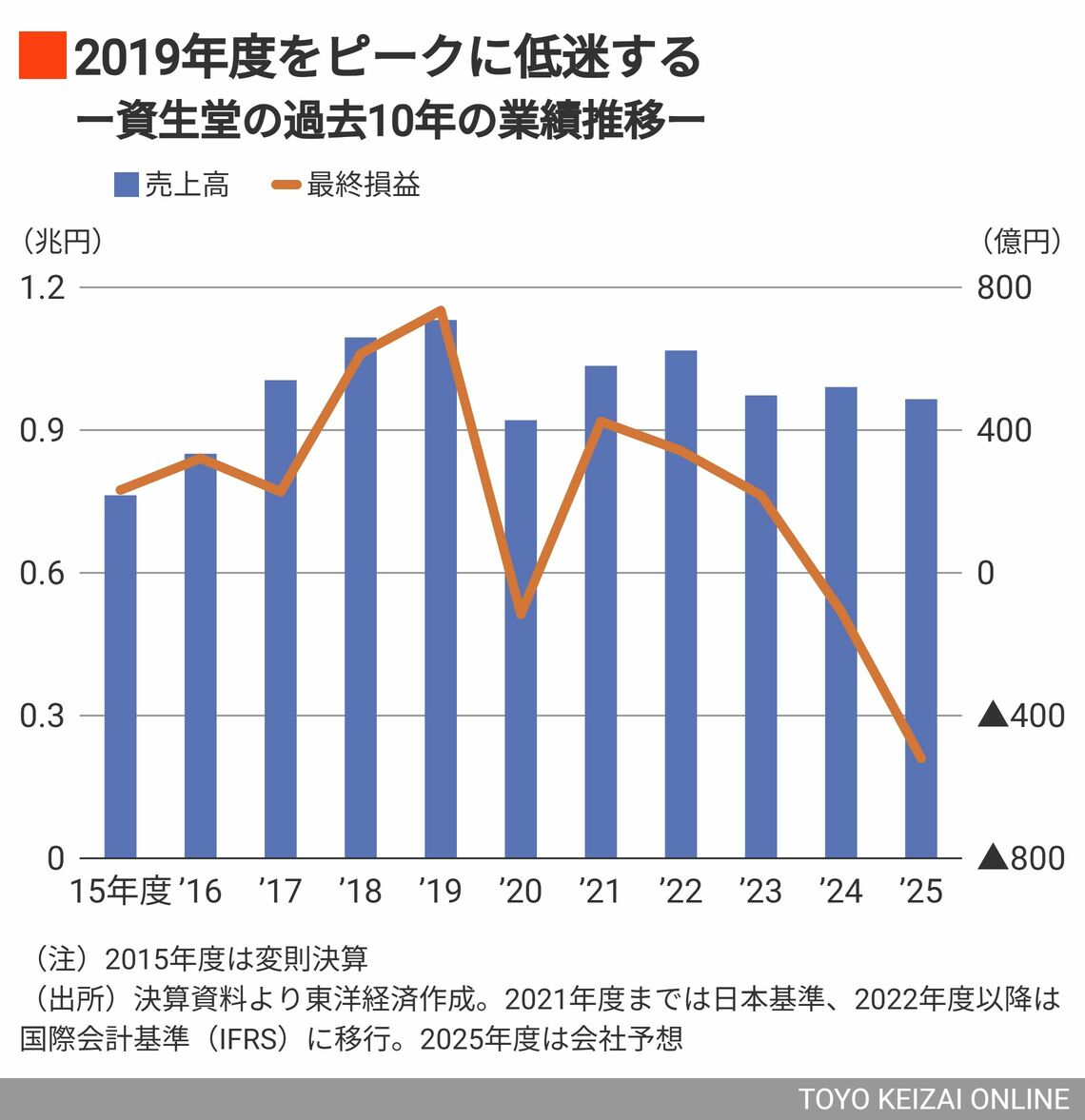 資生堂は11月10日に今期計画を大幅に下方修正した。期初に計画した最終損益は60億円の黒字だったが、一転して過去最大となる520億円の赤字となる見通し。最終赤字は前期に続いて2期連続だ。