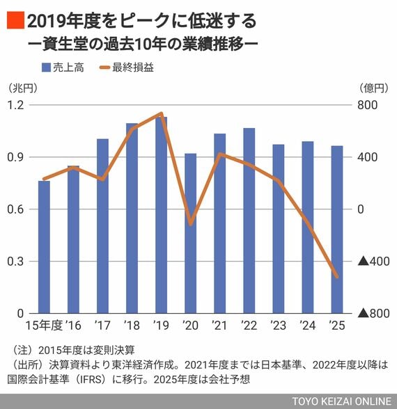 資生堂は11月10日に今期計画を大幅に下方修正した。期初に計画した最終損益は60億円の黒字だったが、一転して過去最大となる520億円の赤字となる見通し。最終赤字は前期に続いて2期連続だ。