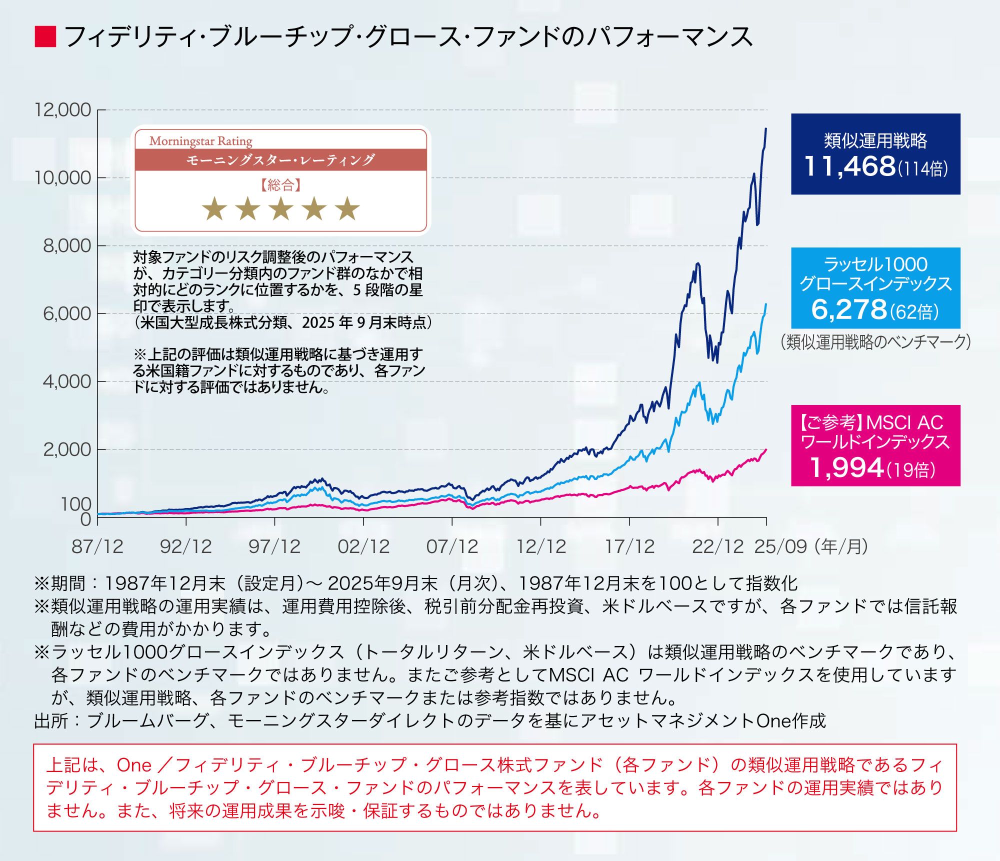 同ファンドはアセットマネジメントOneが設定し、フィデリティ・インベスメンツが実質的に運用している。同ファンドと類似の運用戦略である「フィデリティ・ブルーチップ・グロース・ファンド」(以下、類似運用戦略)は、1987年12月にアメリカで運用が始まり、37年を超えて数々の金融危機を乗り越えてきた歴史がある。そのパフォーマンスは2025年9月末時点で約114倍となっており、優れた実績は外部評価機関からも高い評価を獲得している。「One/フィデリティ・ブルーチップ・グロース株式ファンド」は、その運用戦略を、日本の個人投資家向けの公募投信として提供している。