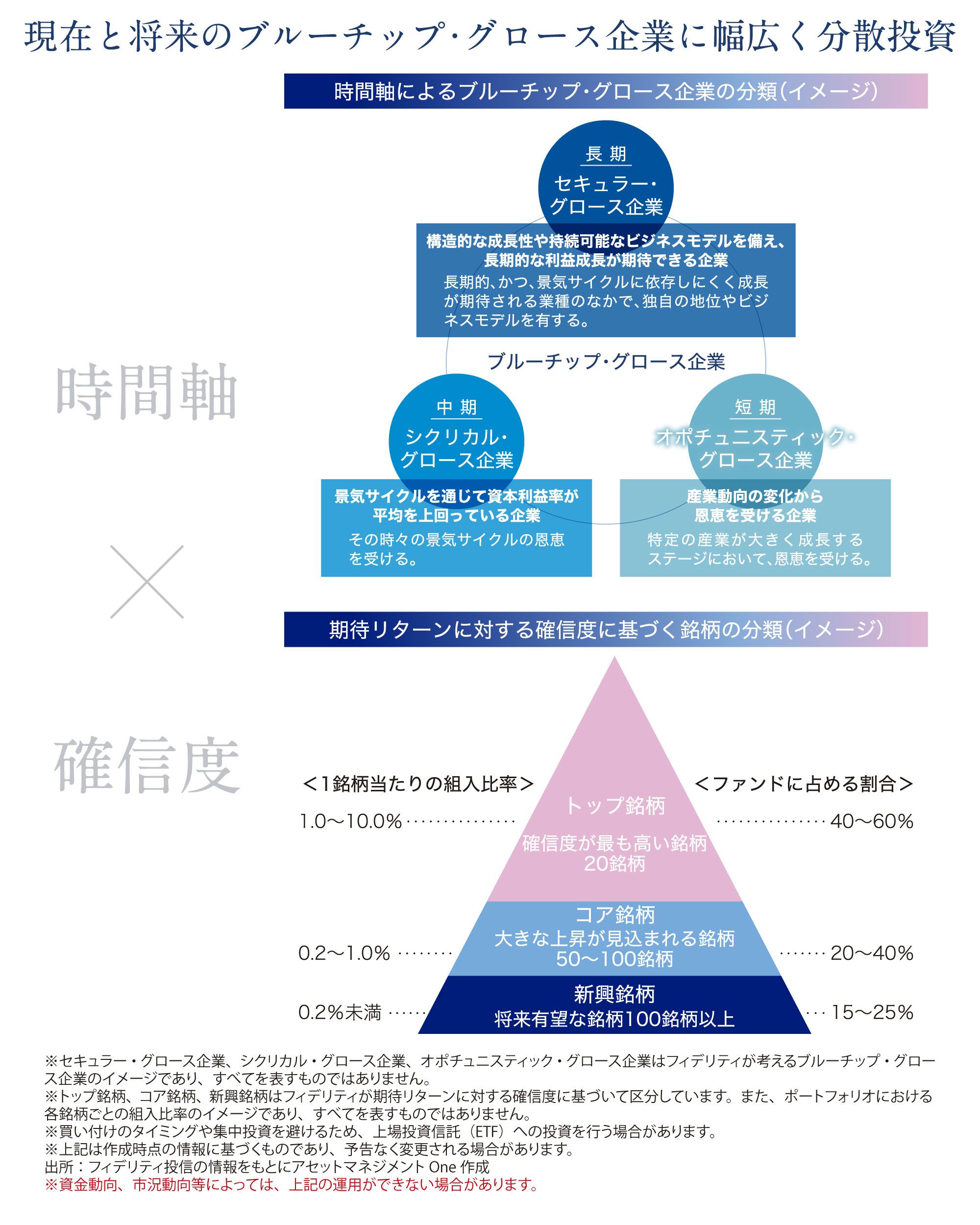 こうした流れの中で注目されるのは、「One/フィデリティ・ブルーチップ・グロース株式ファンド(成長型/隔月決算・予想分配金提示型/毎月決算・予想分配金提示型)」(以下、同ファンドまたはOne/フィデリティ・ブルーチップ・グロース株式ファンド)だ。「ブルーチップ」とは、収益性や成長性が高く、財務的にも安定した優良企業を指す言葉だ。同ファンドでは、この概念を基に、持続的な成長が期待できる企業へ長期的な視点で投資していくフィデリティ※1の旗艦戦略を採用している。