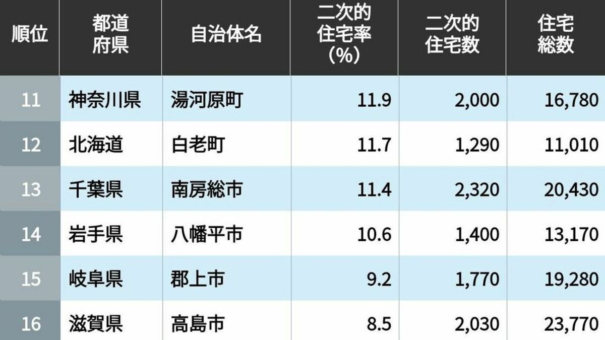 今回、総務省の「令和5年住宅・土地統計調査」の市区町村別データを基に「別荘・セカンドハウスの割合が高い自治体ランキング」を作成した。