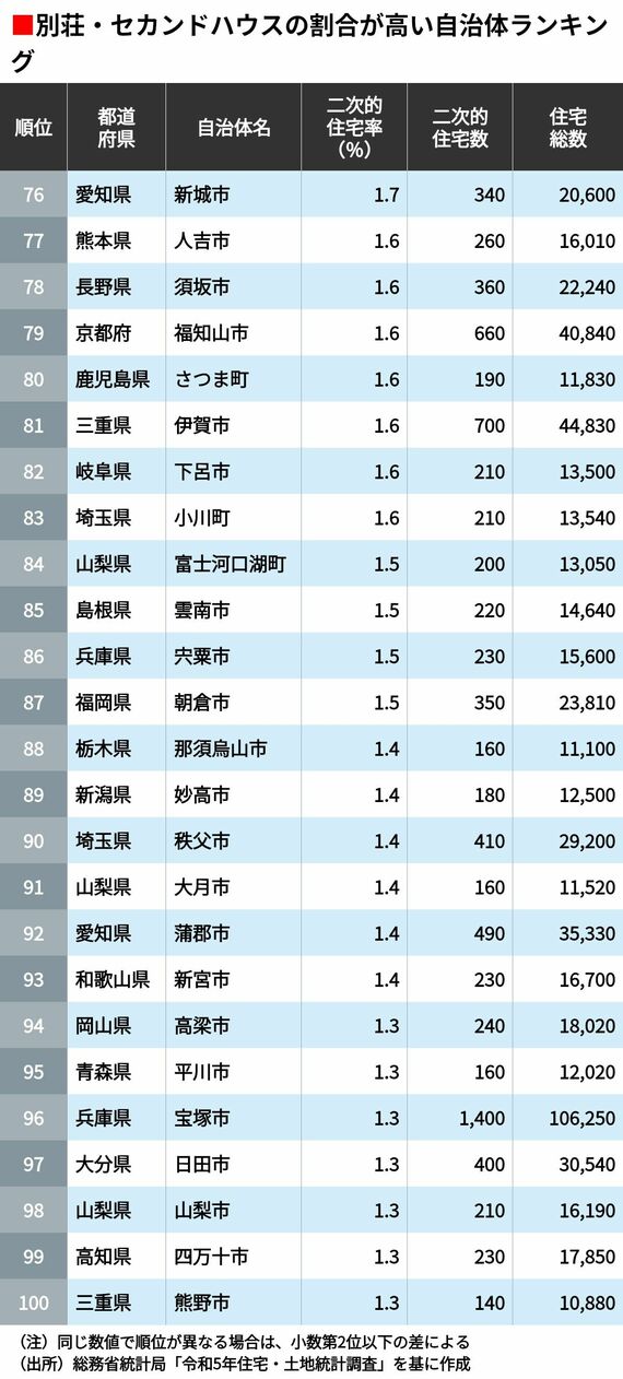 別荘・セカンドハウスの割合が高い自治体TOP100  5位は静岡県熱海市、4位長野県芽野市、ではトップ3は?