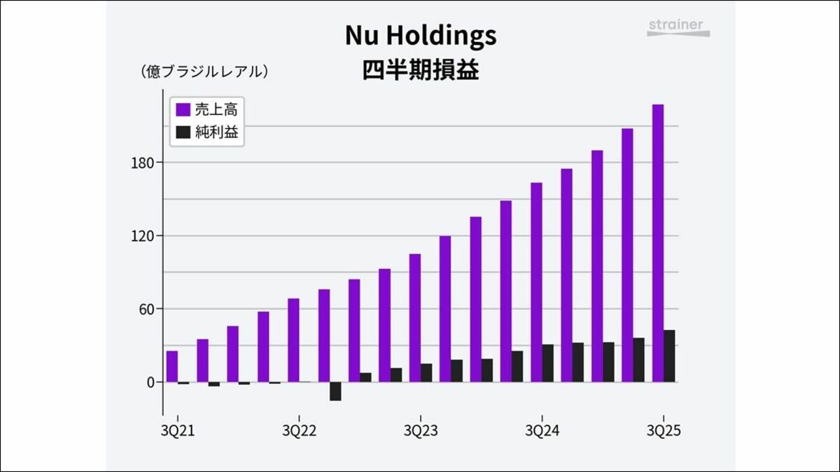中南米最大のデジタルバンクであるNu Holdingsが11月13日、2025年7〜9月期決算を発表しました。売上高は42億ドル(前年比42%増)に加速し、純利益は7.8億ドル(同41%増)へと拡大。いずれも過去最高を更新しています。