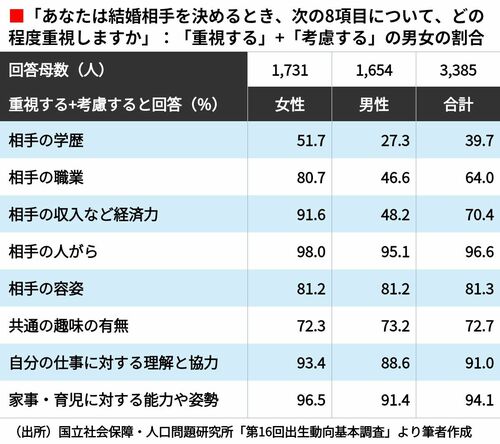 男女ともに相手に求める条件で「重視する+考慮する」の割合が最も高かったのは女性98.0%、男性95.1%で「人柄」である。「相手の容姿」は女性では5位、男性では4位であり、ともに「ルッキズムだ!」と主張するほど優先順位がほかの選択肢よりも高いとは言えない。