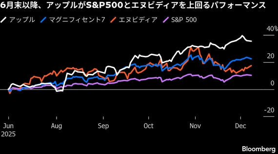 アップル、AI投資疲れの株式市場で脚光-年初の出遅れが一転して強みに