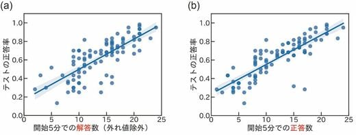 テスト全体の正答率ともっとも強い相関を示したのは、テスト開始直後(最初の5分間)の「解答数」と「正答数」でした。