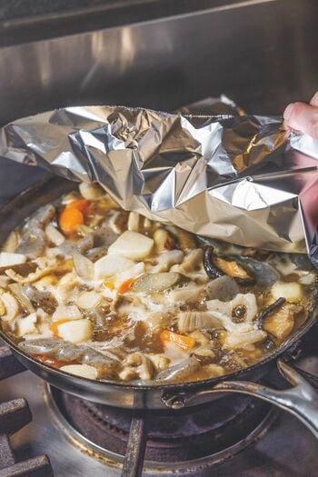 ⑤Aを加えて煮立たせ、アクをとる。弱火にしてアルミ箔で落としぶたをし、10分ほど煮る。筋を除いた絹さやを加え、さっと煮て火を止める。そのまま冷まして味を含ませる。