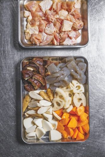 ②れんこん、里芋、にんじんは皮をむいてひと口大に切る。ごぼうはたわしで軽くこすって洗い、皮ごとひと口大に切る。こんにゃくは5mm厚さに切り、真ん中に1cmくらいの切り目を入れ、端を穴にくぐらせる(手綱こんにゃく)。鶏肉は余分な脂や筋を取り除き、ひと口大に切る。野菜も鶏肉も同じくらいの大きさに揃えるとよい。