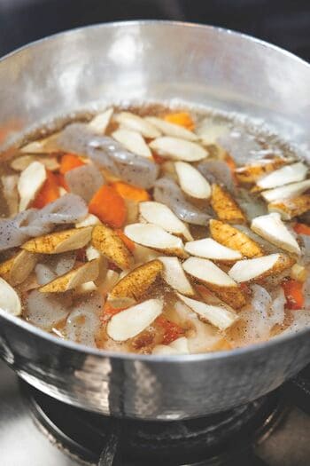 ③②の野菜とこんにゃくは一緒に鍋に入れて水から下ゆでし、煮立ったら弱火にして5分ほどゆで、湯をきる。下ゆですることでアクを抜いて火の通りを早くする。