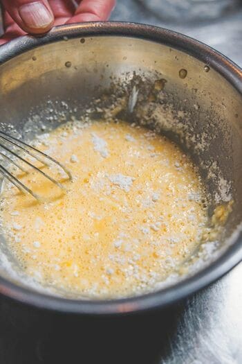 ④別のボウルにAの卵黄と冷水を入れてよく混ぜ合わせ、小麦粉を加えてさっくり混ぜる。多少粉っぽさが残っていてもいい。